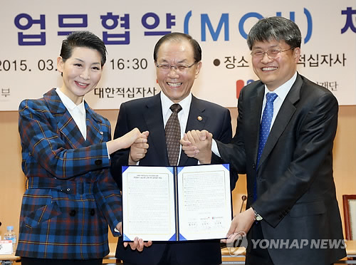 | △ 교육기부 업무협약 체결식 (서울=연합뉴스) 김성주 대한적십자사 총재(왼쪽부터)와 황우여 사회부총리 겸 교육부 장관, 김승환 한국과학창의재단 이사장이 19일 오후 서울 중구 대한적십자사 본사에서 열린 창의인재 및 인도주의 글로벌 리더 양성을 위한 나눔교육 교육기부 업무협약(MOU) 체결식에서 협약서에 서명 후 기념촬영을 하고 있다. (교육부 제공) |