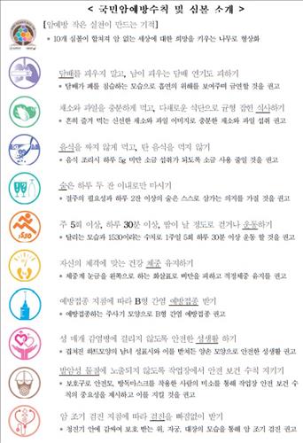 복지부는 국내외 연구 결과와 국외 적용 사례, 국내 전문가들의 합의를 거쳐 '국민 암예방 수칙'을 제정하고 국민들이 암 예방을 실천하도록 돕고 있다.