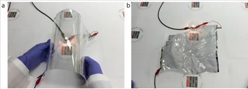 | △ 유연한 투명전극 유연성 실험. A4 용지 크기로 만든 플렉시블 투명전극이 휘어진 상태(a)와 종이처럼 구긴 상태(b)에서도 정상적으로 작동해 전구가 켜진 모습. |