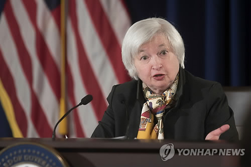 | △ '인내심' 내려놉니다 (AP=연합뉴스) 18일(현지시간) 미국 중앙은행인 연방준비제도(연준·Fed)의 워싱턴DC 본부에서 재닛 옐런 연준 의장이 연방공개시장위원회(FOMC) 정례회의 결과에 관해 기자회견하고 있다. |