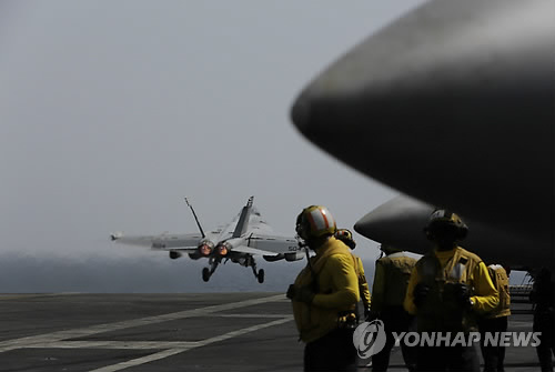 | △ IS 공습 나서는 美항모 칼빈슨 함재기 (AP=연합뉴스) 걸프만에 머물고 있는 미국 해군 항공모함 칼빈슨에서 19일(현지시간) 함재기 한 대가 이라크 북부 수니파 극단주의 무장세력 '이슬람국가'에 대한 공습 임무를 수행하기 위해 이륙하고 있다. marshal@yna.co.kr |