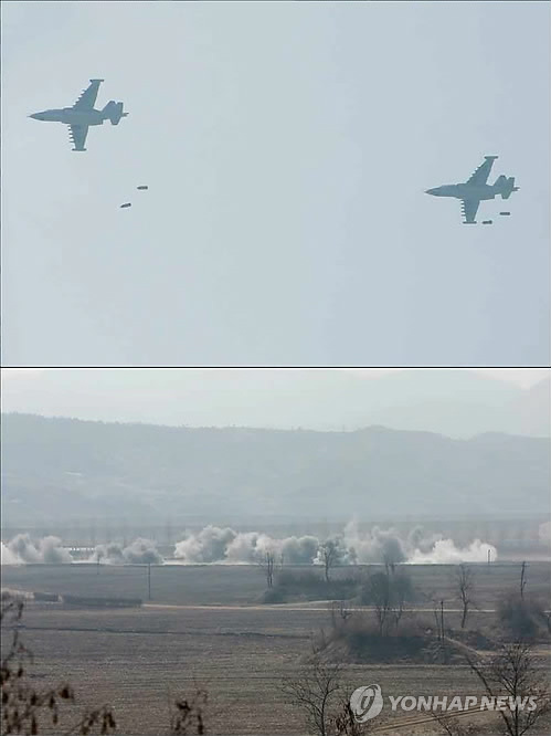 | △ 북한, 공군 비행장 타격훈련 (서울=연합뉴스) 북한이 김정은 국방위원회 제1위원장의 참관 하에 공군의 비행장 타격·복구 훈련을 벌였다. 노동신문이 20일 게재한 사진에는 북한 전투기가 폭발물을 투하하는 모습과 지상의 목표물을 타격하는 모습이 담겼다. 2015.3.20 nkphoto@yna.co.kr |