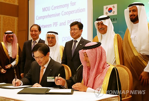 | △ 포스코, 사우디 국부펀드 포괄적 협력 MOU (서울=연합뉴스) 포스코는 사우디아라비아 국부펀드인 퍼블릭인베스트먼트펀드(PIF)와 전략적 제휴를 통해 건설, 자동차를 포함한 전 산업 분야에 걸친 포괄적 협력관계를 구축하기로 했다고 4일 밝혔다. 권오준 포스코 회장(왼쪽)과 압둘라만 알 모파디 퍼블릭인베스트먼트펀드(PIF) 총재가 협약서에 서명하고 있다. 2015.3.4 << 포스코 제공 >> photo@yna.co.kr |