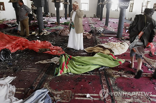(카이로=연합뉴스) 한상용 특파원 = 예멘 수도 사나에 있는 모스크(이슬람 사원)에서 20일(현지시간) 연쇄 폭탄 테러가 발생해 500명 가까이 사망하거나 부상했다.