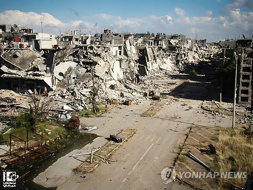 | △ 시리아 반군거점의 폐허 (AP/LYH=연합뉴스) 시리아 반군 요충지인 중부 홈스 지역 빌딩들이 정부군의 공습과 박격포 공격으로 파괴된 모습으로, 반정부활동 단체 렌스 영 홈시(LYH)가 2013년 5월13일 제공한 사진. 2012년 6월 이후 홈스시 외곽을 포위 중인 시리아 정부군은 최근 구 시가에서 필사의 저항을 계속중인 반군에 대한 공세를 강화하고 있다. bulls@yna.co.kr |