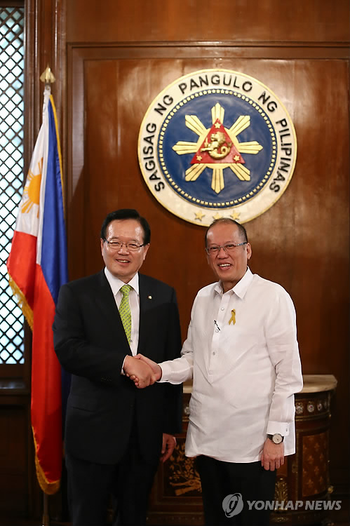 | △ 정 의장, 아키노 대통령 예방 (서울=연합뉴스) 필리핀을 방문 중인 정의화 국회의장이 16일 마닐라 대통령궁에서 아키노 대통령을 예방하고 있다. 2015.3.16 <<국회 대변인실 제공>> zjin@yna.co.kr |