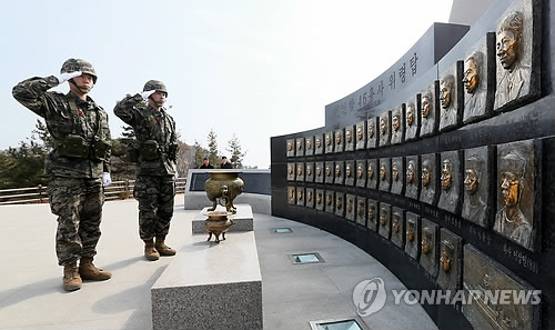 | △ 46용사 향해 경례하는 해병들 (인천=연합뉴스) 윤태현 기자 = 천안함 폭침 5주기를 나흘 앞둔 22일 서해 최북단 백령도는 그날의 충격을 잊은 듯 평온한 모습이다. 그러나 백령도 주민들은 여전히 북한의 도발에 불안감을 감추지 못하고 있다. 해병 6여단 장병은 평시에도 전시상황과 다름없는 경계태세를 유지하고 있다. 사진은 지난 16일 천안함 46용사 위령탑 앞에서 경례하는 해병들 모습. 2015.3.22 tomatoyoon@yna.co.kr |