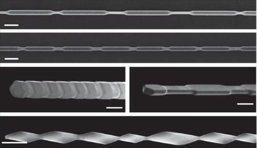 | △ 다양하게 합성된 반도체 나노선. 실리콘 나노선 혹은 게르마늄 나노선 위에 주기적인 실리콘 및 게르마늄 껍질을 형성할 수 있다. 합성 조건에 따라 껍질의 두께와 주기, 단면의 모양까지도 원하는 대로 조절할 수 있다. |