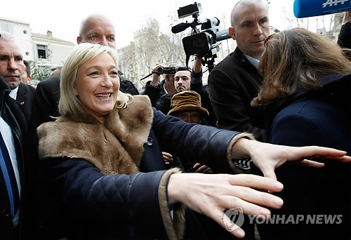 | △ (AP=연합뉴스) 프랑스 극우정당 국민전선의 마린 르펜 대표(왼쪽)가 17일(현지시간) 아비뇽의 한 시장에서 지지를 호소하고 있다. 오는 22일 지방선거 1차 투표를 앞둔 가운데 국민전선은 이민자 문제, 치안 등에 대한 경각심과 기성정당들에 대한 불만에 힘입어 그 인기가 상승하고 있다. |