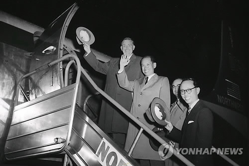 | △ '건국 1세대' 송인상 전 재무부 장관 별세 (서울=연합뉴스) 재무부 장관과 초대 한국수출입은행장을 지낸 송인상 한국능률협회(KMA) 명예회장이 22일 별세했다. 향년 101세. 사진은 부흥부 장관 시절 방미의 길에 오르는 송인상 한국능률협회 명예회장(왼쪽에서 두번째). 2015.3.22 << 한국능률협회(KMA) 제공 >> photo@yna.co.kr |