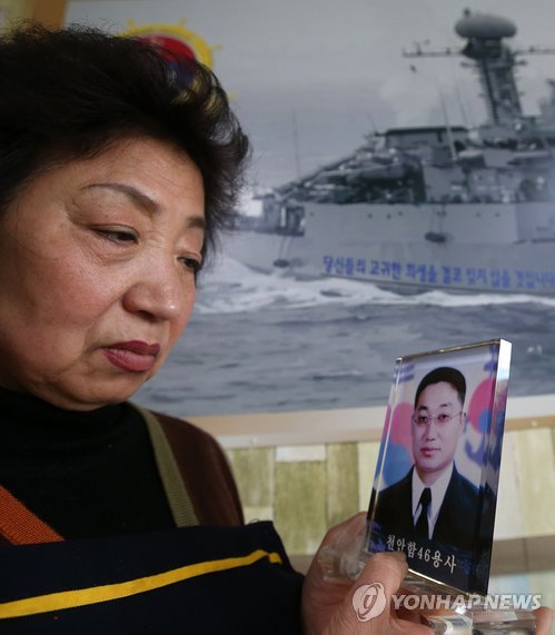 | △ 해군 2함대 앞 지키는 천안함 46용사 어머니 (평택=연합뉴스) 신영근 기자 = 천안함 사건 5주년을 사흘 앞둔 23일 오후 경기도 평택 해군 제2함대사령부 앞에서 한식당 '석정'을 운영하고 있는 천안함 46용사 故 문규석 원사의 어머니 유의자(64)씨가 천안함 사진 앞에서 아들의 얼굴을 바라보고 있다. 2015.3.23 drops@yna.co.kr http://blog.yonhapnews.co.kr/geenang |
