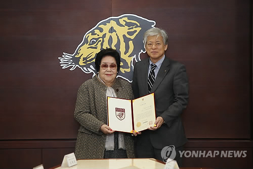 | △ 고대 경영대 여성1호 졸업생, 모교에 5억 또 쾌척 (서울=연합뉴스) 고려대는 경영대학 여성 1호 졸업생인 상학과 51학번 전윤자씨가 장학기금으로 현금 5억원을 학교에 쾌척했다고 23일 밝혔다. 앞서 지난 2010년 전씨는 5억원 상당의 부동산을 학교에 기부해 '전윤자 장학금'을 조성, 임대수익을 매학기 경영대 후배 2명에게 장학금으로 지급해왔다. 사진은 전씨와 염재호 고려대 총장. (고려대 제공) |