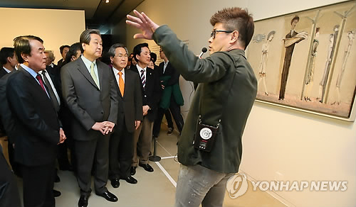 | △ 마크 로스코展 개막 (서울=연합뉴스) 박지호 기자 = 23일 오후 서울 예술의전당 한가람미술관에서 열린 '마크 로스코展' 개막식에서 송현승 연합뉴스·연합뉴스TV 사장(왼쪽에서 첫번째), 새누리당 김무성 대표(왼쪽에서 두번째), 새정치민주연합 우윤근 원내대표(왼쪽에서 세번째)를 비롯한 내빈들이 철학자 강신주씨(오른쪽)의 설명을 들으며 작품을 감상하고 있다. |