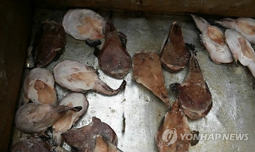 | △ 유통기한 넘긴 냉동 아귀 (부산=연합뉴스) 유통기한을 최대 10년 이상 넘겨 냉동 수산물을 보관해온 유통업체들이 무더기로 경찰에 적발됐다. 사진은 10년이나 유통기한을 넘긴 냉동 아귀 모습. 2015.3.25 << 부산 서부경찰서 >> wink@yna.co.kr |