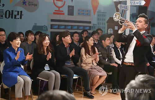 (서울=연합뉴스) 박성민 기자 = 박근혜 대통령은 3월 '문화가 있는 날'인 25일 오후 종로구 동숭동 대학로의 '예술가의 집'을 찾아 청년예술인들이 직접 기획·제작한 '꿈틀쇼 : 청년예술인, 꿈의 채널을 틀어라'라는 제목의 토크콘서트에 참석했다.