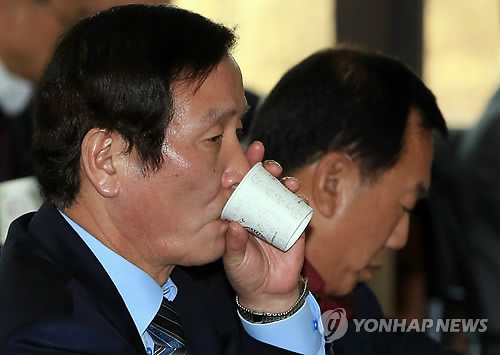 | △ 속 타는 개성공단기업협회장 (서울=연합뉴스) 홍해인 기자 = 정기섭 개성공단기업협회장이 25일 오후 서울 여의도 중소기업중앙회에서 열린 협회 총회에 참석해 김남식 개성공단지원재단 이사장의 인사말을 듣던 중 물을 마시고 있다. 이날 정부는 개성공단 북한노동자 임금 인상문제와 관련해 남북간 협의를 거쳐야 한다는 기존 입장을 유지한다고 밝혔다. 2015.3.25 hihong@yna.co.kr |