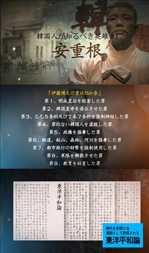 6분44초 분량의 이 영상은 안중근 의사 의거의 개요, 현재 각국에서 안중근을 추모하고 재평가하는 분위기, 세계가 인정하는 '동양평화론'에 관한 해설 등을 담고 있다.