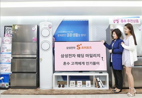 작년 7월부터 도입한 웨딩 마일리지는 3개월간 삼성 디지털프라자 혼수전문점에서 가전제품을 구매한 금액과 삼성카드[029780] 사용 실적에 따라 현금처럼 사용할 수 있는 포인트를 최대 200만원까지 제공하는 프로그램이다.