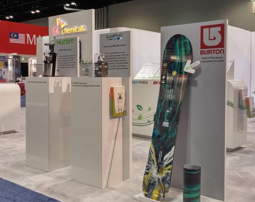 SK케미칼은 홍보부스에 휴롬 주스기 등 자사 소재로 만들어진 제품과 액션카메라용 투명케이스 등을 전시했다.