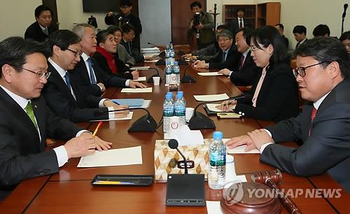 | △ 조원진, 강기정 공동위원장 등이 25일 국회에서 열린 공무원연금개혁 국민대타협기구 대표자회의에서 향후 일정 등에 대해 논의하고 있다. |