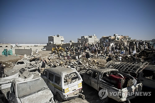 | △ 사우디-이란 대리전? (AP=연합뉴스) 수니파 왕정의 사우디아라비아 등 아랍권 국가가 26일(현지시간) 예멘의 시아파 후티 반군을 상대로 군사작전을 전격 개시한 가운데 공습을 받아 파괴된 사나공항 인근의 주택가에서 주민들이 생존자 구조 작업을 벌이고 있다. 사우디는 이번 작전에 전투기 100대를 동원했으며 지상군 15만명도 파병키로 한 것으로 알려졌다. 후티 배후로 사우디 숙적인 시아파 종주국 이란이 지목되면서 사우디와 이란 간의 대리전으로 확산되는 것 아니냐는 우려도 제기되고 있다. |