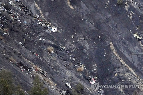 | △ 24일 오전(현지시간) 독일 저가항공사 저먼윙스 여객기가 추락한 프랑스 남부 세인 레 잘프스 부근 해발 1천500m 높이의 알프스 산악에 비행기 잔해가 형체를 알 수 없이 흩어져 있다. (AP=연합뉴스) |