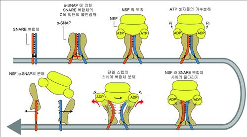 | △ NSF/α-SNAP에 의한 SNARE 복합체 분해 과정. NSF에 에너지원인 ATP(아데노신3인산)을 공급하면 용수철처럼 내부에 에너지가 축적됐다가 한꺼번에 방출되면서 SNARE 복합체를 폭발적으로 풀어낸다. |