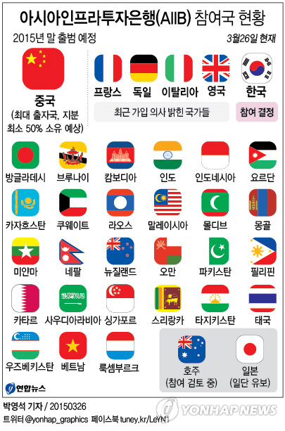 특히 동북아의 또 다른 동맹인 일본과 대조적인 행보를 보이는 것으로 비치는 것도 미묘한 대목이다. 일본 정부는 이달 말로 참여시한이 다가온 AIIB 가입에 여전히 신중한 입장을 보이고 있다.