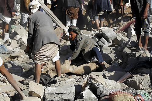 | △ epa04679307 Yemenis search for survivors under the rubble of houses that allegedly were destroyed by a Saudi air strike, in Sana'a, Yemen 26 March 2015. Saudi Arabia and other Gulf states launched air strikes against Houthi rebels which have taken over large parts of Yemen, attacking the Sana'a military Airport and Jiraf area, a Houthi stronghold. The strikes were 'in support of the people of Yemen and their legitimate government,' Saudi Arabia's Washington ambassador Adel al-Jubeir said. The military operation by a 'coalition of over 10 countries' was in response to an appeal from embattled Yemeni President Abdo Rabbo Mansour Hadi, al-Jubeir said. EPA/YAHYA ARHAB |