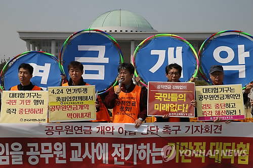 (서울=연합뉴스) 박인영 기자 = 전국교직원노동조합은 국민대타협기구 활동 종료를 하루 앞둔 27일 국회 앞에서 기자회견을 열어 "공무원·교원의 일방적 희생만을 강요하는 일체의 공무원 연금 개악안 검토를 중단하라"고 촉구했다.