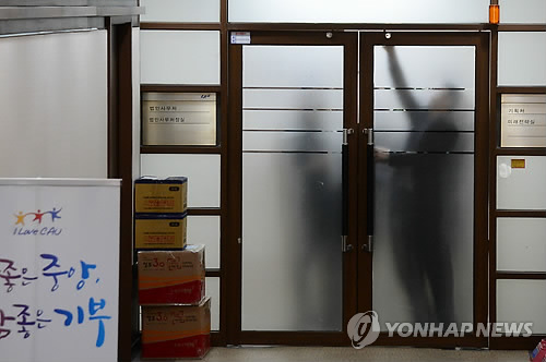 | △ 검찰, 중앙대학교 압수수색 (서울=연합뉴스) 김주성 기자 = 이명박 정부 시절 청와대 교육문화수석을 지낸 박범훈 전 중앙대 총장의 비리 혐의를 수사 중인 검찰이 27일 오전 서울 흑석동 중앙대학교를 압수수색했다. 학교 관계자들이 압수수색이 진행 중인 기획처, 법인사무처, 미래전략실 등이 있는 사무실 문을 잠그고 있다. |