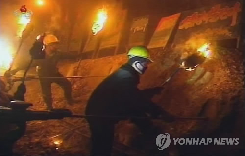 | △ 전력난으로 횃불 들고 일하는 북한 건설노동자들 (서울=연합뉴스) 북한 조선중앙TV는 지난 3일 건설 중인 자강도 희천9호발전소의 야간작업장을 소개하는 '현지방송 - 공격전의 불길 세차게 타오르는 야간전투장' 제목의 프로그램에서 평양시여단의 노동자들이 전깃불 없이 횃불을 들고 작업하는 모습을 방영했다.2013. 5. 6 <<조선중앙TV>> nkphoto@yna.co.kr |
