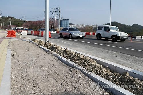 | △ 중단된 울산 성안로 확장 공사 (울산=연합뉴스) 김근주 기자 = 울산 성안로 확장공사가 LH와 울산시의 시유지 보상문제로 수개월째 중단됐다. 30일 해당 구간의 모습. 2015.3.30 canto@yna.co.kr |
