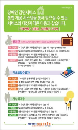 (서울=연합뉴스) 김병규 기자 = 다음달부터 장애인과 기초생활수급자 등은 TV수신료를 비롯해 전기·가스·이동통신의 요금 감면을 주민센터에서 신청할 수 있게 된다.