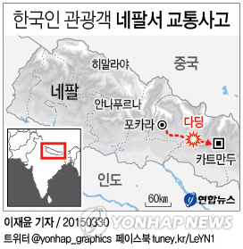 (서울=연합뉴스) 김효정 기자 = 네팔에서 30일 오전(현지시간) 한국인이 탄 렌터카가 버스와 충돌해 차에 탄 한국인 3명이 숨지고 2명이 크게 다쳤다고 외교부 관계자가 밝혔다.