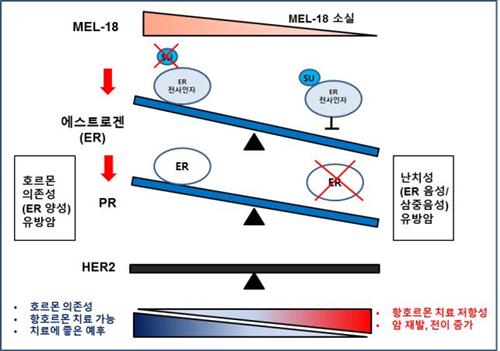 MEL-18 유전자가 에스트로겐 수용체 유전자의 발현 및 활성을 조절, 여성호르몬 수용체를 감소시켜 삼중음성 유방암을 유발하고 항호르몬 치료제 내성을 초래한다는 것이다.