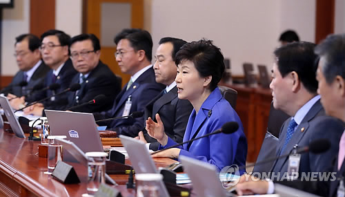 | △ 국무회의서 발언하는 박 대통령 (서울=연합뉴스) 도광환 기자 = 박근혜 대통령이 31일 오전 청와대에서 열린 국무회의에서 현안에 대해 발언하고 있다. |