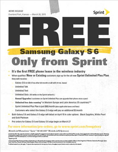 미국 4대 이통사 중 하나인 스프린트는 무제한 요금제에 가입하면 갤럭시S6를 무료로 제공한다고 공식 홈페이지를 통해 31일 공지했다.