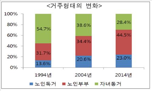 노인부부 가구와 독거가구에 속한 비율은 2004년 조사 때의 34.4%와 20.6%에 비해 각각 10.1% 포인트와 2.4% 포인트 늘어난 것이다.