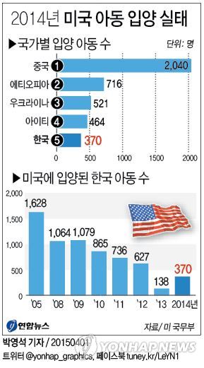 1일(현지시간) 공개된 미 국무부 통계를 보면 2014 회계연도에 미국인 부모가 입양한 외국 어린이는 6천441명으로 직전 회계연도의 7천94명보다 9%나 줄었다.
