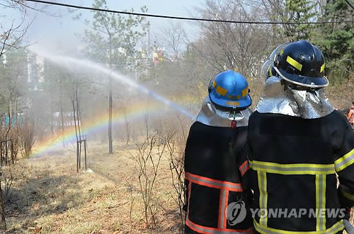 | △ 산불 진압훈련하는 소방공무원과 의용소방대원. <<연합뉴스DB>> |