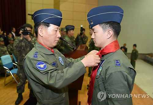 | △ 고등비행교육 수료식 (서울=연합뉴스) 2일 광주 제1전투비행단 기지 강당에서 열린 '15-1차 고등비행교육 수료식'에서 최차규 공군참모총장(왼쪽)이 참모총장상을 받은 이승환 중위에게 공군 조종사의 상징인 '빨간 마후라'를 매어주고 있다. (공군 제공) |
