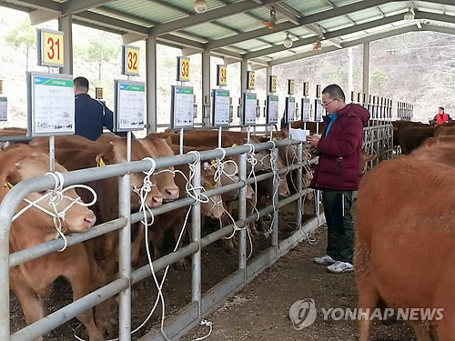 | △ 석달만에 개장한 안성 송아지경매시장 (안성=연합뉴스) 구제역 여파로 3개월여동안 휴장했던 안성축협 송아지 경매시장이 2일 임시 개장돼 송아지 73마리가 거래됐다. 2015.4.2 kcg33169@yna.co.kr |