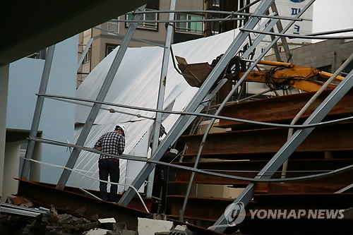 | △ 제주에 분 강풍에 무너진 공사장 펜스 (제주=연합뉴스) 고성식 기자 = 2일 오후 제주시 노형동 한 호텔 공사장의 안전펜스가 강풍으로 쓰려져 근로자가 수리를 하고 있다. 안전펜스는 바로 옆 아파트 담장을 덮쳐 담장 20m가량과 주차장에 세워진 일부 차량이 파손됐다. |