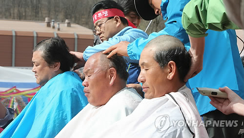 | △ 포천 주민들 '사격장 안전대책 마련' 촉구 삭발 (포천=연합뉴스) 노승혁 기자 = 3일 오후 경기도 포천시 미8군 로드리게스 훈련장(영평사격장) 입구에서 영평·승진사격장 대책위 회원들과 인근 마을 주민들이 안전 대책을 요구하는 집회를 열며 삭발을 하고 있다. 지난해 11월 이후 최근까지 사격장 너머 마을인 영북면에서만 총탄과 포탄이 떨어지는 사고가 세 차례 발생했다. 2015.4.3 nsh@yna.co.kr |