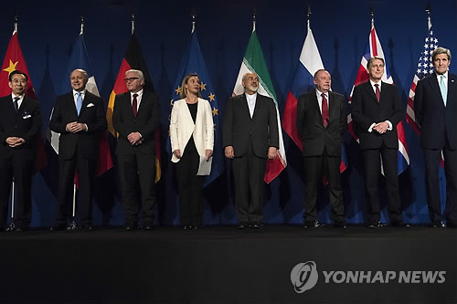 | △ 이란 핵협상 타결 (AP=연합뉴스) 미국 등 주요 6개국과 이란은 2일(현지시간) 이란의 핵개발 활동을 중단하되 이란에 대한 제재는 당분간 유지하는 것을 골자로 하는 잠정 합의안인 포괄적공동행동계획(JCPOA)을 마련하는 데 최종 합의했다. 국제사회와 이란은 이 행동계획을 토대로 6월 30일까지 세부적이고 기술적인 사항에 대한 최종 합의에 도달하기 위해 협상을 계속하게 되며 이란이 합의안과 관련한 핵심 조치를 취했다는 점이 검증되면 오는 6월 최종 합의문이 나오는 대로 국제사회의 이란 제재는 종료된다. 사진은 이날 스위스 로잔에서 마라톤 협상을 통해 잠정 합의안을 도출해 낸 뒤 포즈를 취하고 있는 존 케리 미 국무장관(맨 오른쪽)과 필립 해먼드 영 외무장관(오른쪽 두번째), 무함마드 자바드 자리프 이란 외무장관(오른쪽 네번째), 페데리카 모게리니 유럽연합(EU) 외교안보 고위대표(왼쪽 네번째), 프랑크 발터 슈타인마이어 독 외무장관(왼쪽 세번째), 로랑 파비우스 프랑스 외무장관 등 협상 대표자들. |