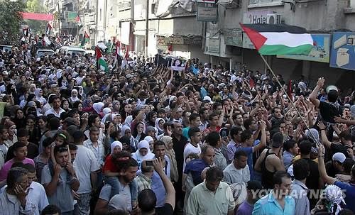| △ (EPA=연합뉴스) 수니파 무장세력 이슬람국가(IS)가 4일(현지시간) 시리아 수도 다마스쿠스 남쪽의 팔레스타인 난민을 수용한 야르묵 캠프의 90%를 장악했다고 시리아인권관측소(SOHR)가 밝혔다. 사진은 지난 2011년 6월6일 야르묵 캠프에서 사람들이 이스라엘군의 총격에 사망한 팔레스타인인 8명에 대한 추모 집회를 여는 모습. (끝) |