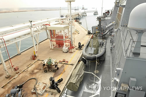 | △ 지부티항에 정박하는 청해부대 왕건함 (서울=연합뉴스) 지난 3일 왕건함이 주 예멘 대한민국 대사관 직원을 탑승시키기 위해 지부티항에 정박을 하고 있다. 2015.4.5 << 합참 제공 >> photo@yna.co.kr |