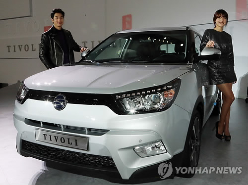 | △ 쌍용차, SUV 티볼리 출시 (서울=연합뉴스) 최재구 기자 = 13일 서울 동대문디자인플라자에서 모델들이 쌍용차의 SUV 티볼리를 선보이고 있다. 티볼리는 새로 개발한 e-XGi160 가솔린 엔진에 아이신의 6단 자동변속기를 맞물려 최대 출력 126마력, 최대토크 16.0㎏.m의 힘을 발휘한다. 2015.1.13 jjaeck9@yna.co.kr |