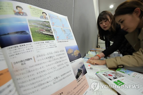 | △ 일본교과서의 궤변 (서울=연합뉴스) 이정훈 기자 = '한국이 독도를 불법 점거하고 있다'는 일본 정부의 일방적인 주장이 내년부터 사용될 일본의 새 중학교 사회과 교과서 대다수에 실린다. 일본 문부과학성은 6일 교과용 도서 검정조사심의회를 열어 이 같은 중학교 교과서 검정 결과를 확정했다. 사진은 이와 관련해 이날 오후 동북아역사재단에서 열린 긴급 학술회의에 전시된 2011년 일본중학교 역사·지리·공민 교과서와 이 교과서들에 실린 한국의 독도 불법 점거를 주장하는 문구. |